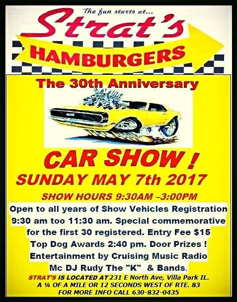 Strat's Diner has been the meeting place for auto enthusiasts for 30 years. They are throwing a Special Three Day Event to mark this occasion. Friday night the 5th. Traditional old School Hot Rods Cruise Nights 2017 season starts with the Wanders Car Club. Also Portable Drive in Movie Night. Saturday the 6th 5m till closing Modern Muscle Cars & Cycles Cruise Night. Dine In and pick up a commemorative one per customer. Sunday the 7th Is the Car Show. Open to all years of Show Vehicles Registration 9:30 am to 11:30 am. Special commemorative for the first 30 registered. Entry Fee $15 Top Dog Awards 2:40 pm. Door Prizes Entertainment by Cruising Music Radio Mc DJ Rudy The K and Bands. Strat's is located at 231 E. North Ave. Villa Park IL. A Quick 1/4 Mile west of Rte. 83 Phone number 630 832-0435
